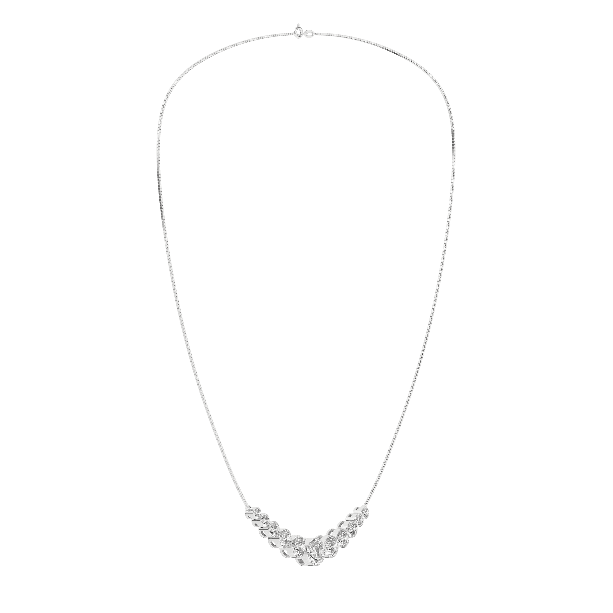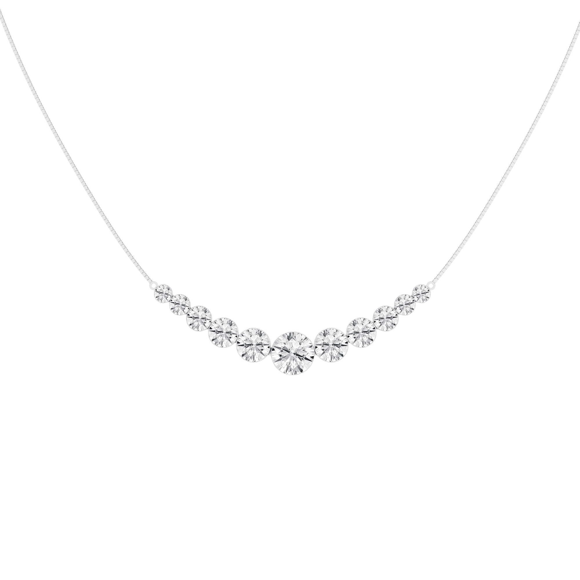 Embrace the pinnacle of elegance and innovation with the Seamless Graduated Diamond Necklace. Featuring 3.46 ctw, this stunning necklace showcases round lab grrown diamonds, perfectly set in luxurious 14KT White Gold. The diamonds are arranged in a graduated pattern, creating a harmonious flow that accentuates the neckline. The innovative seamless setting minimizes the presence of metal from the top view, allowing each diamond to shine with maximum brilliance.