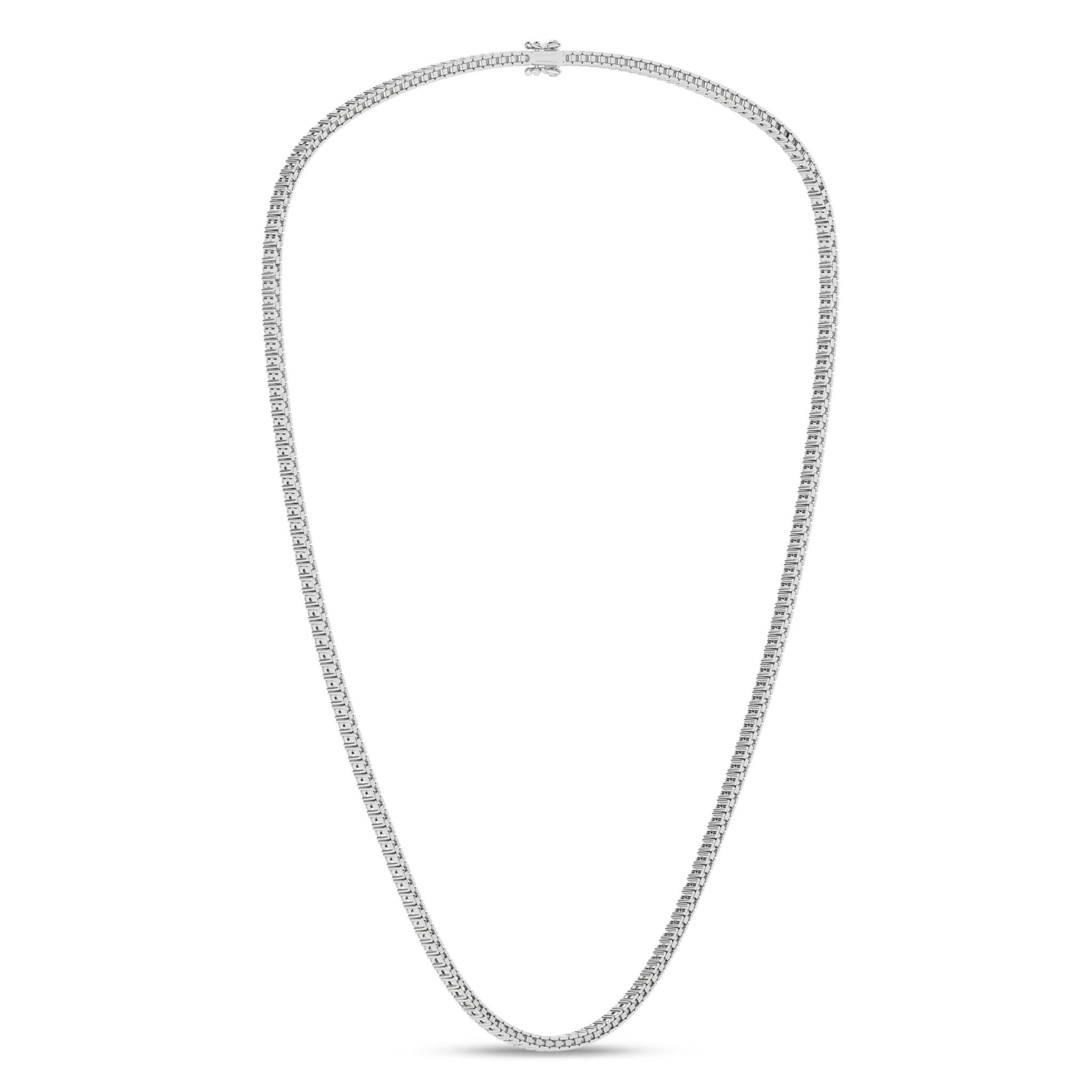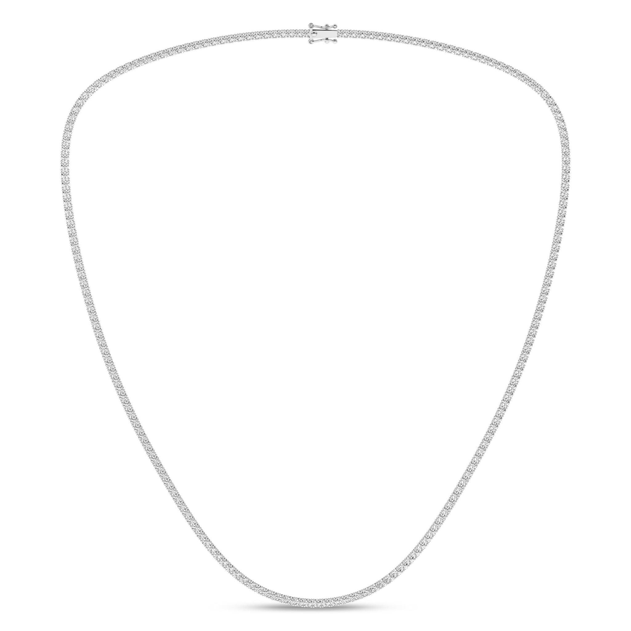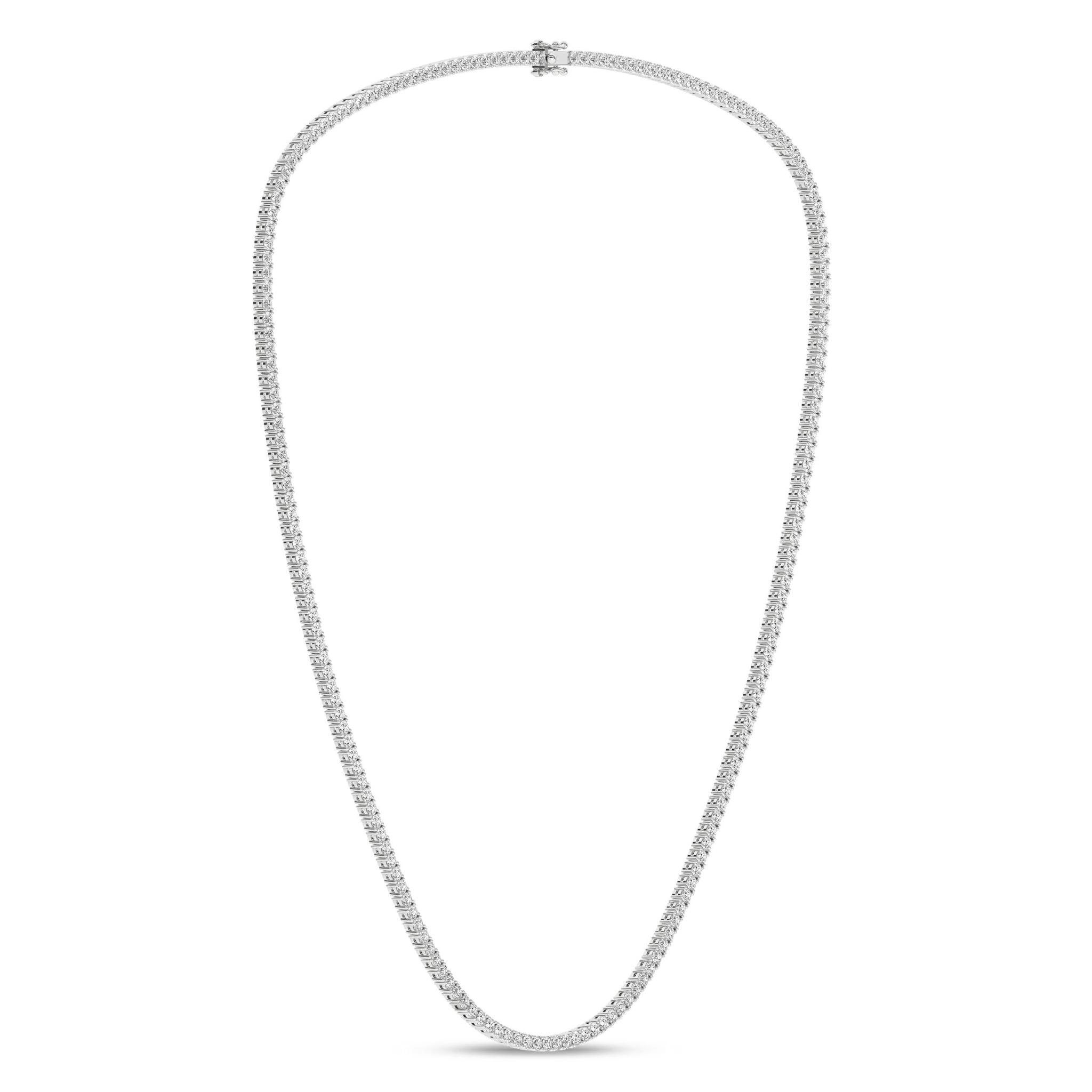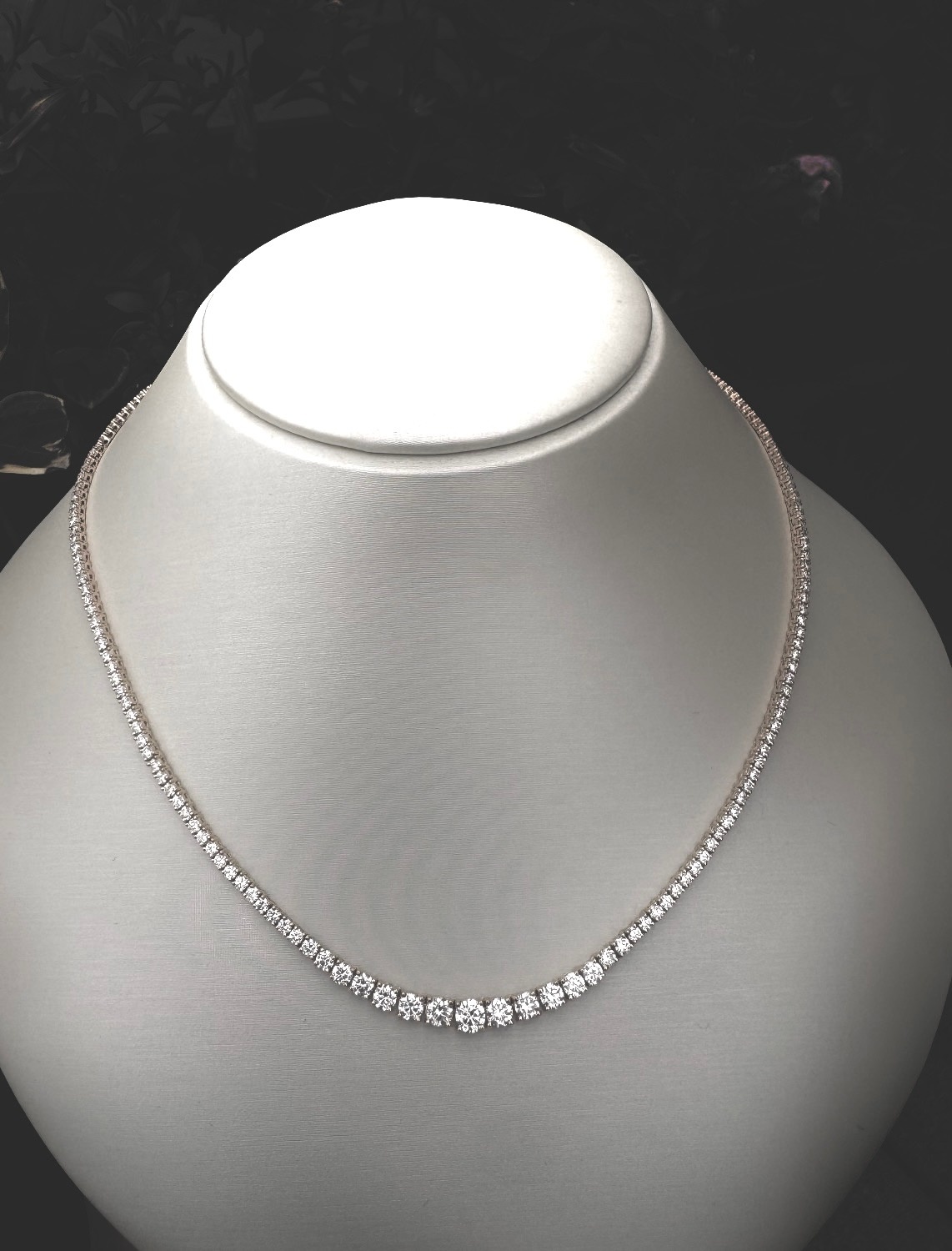 Classic Lab Grown diamond graduation Riviera necklace, certified by IGI to ensure quality, set in 14KT white gold, and studded with 7 ctw of diamonds in a timeless four-prong setting. The 17-inch necklace features diamonds boasting EF color and VS clarity, forming an exquisite piece that radiates elegance and captures the essence of sophistication.