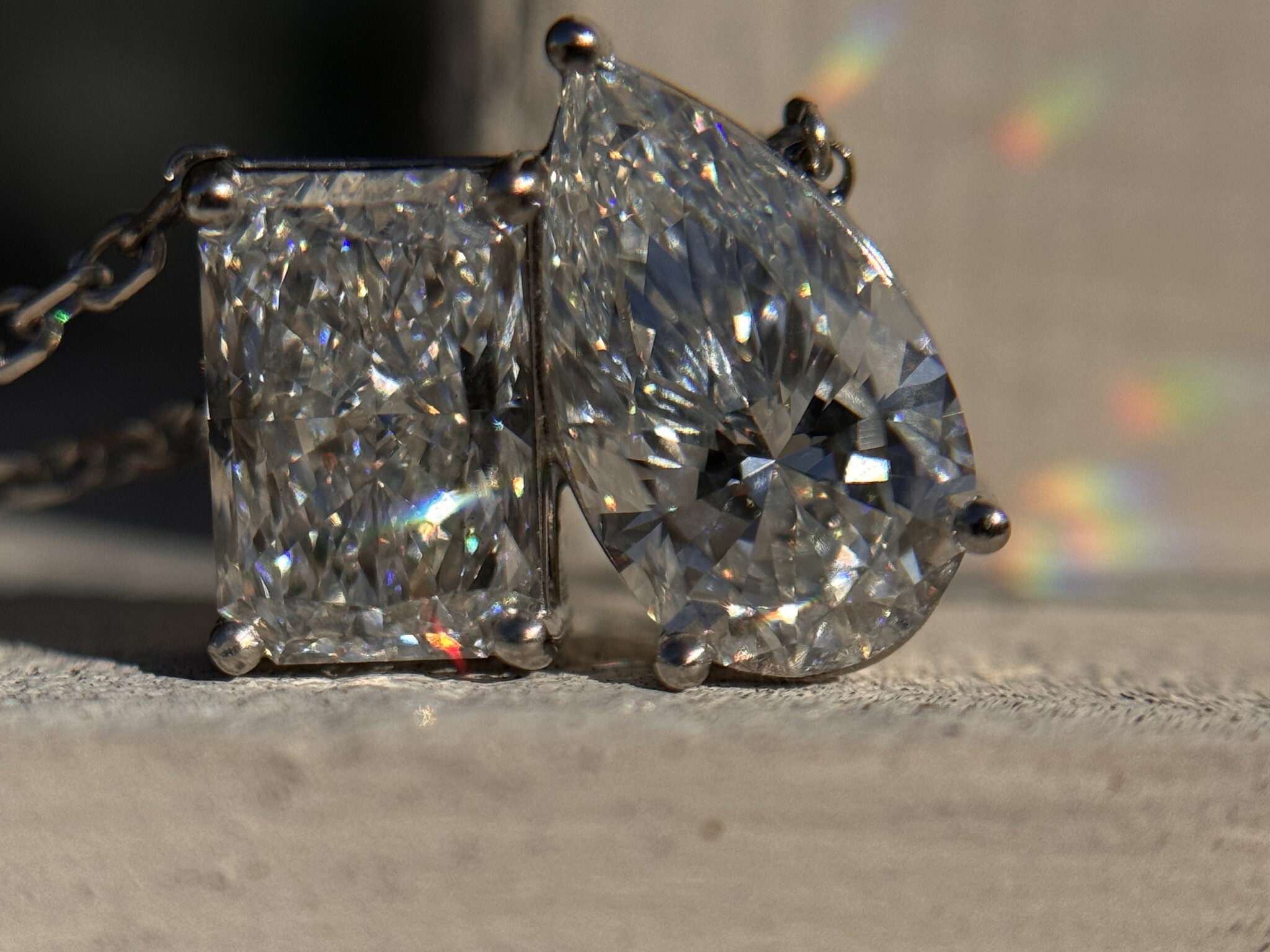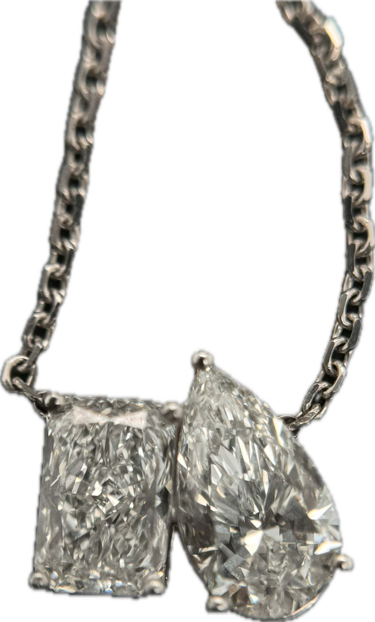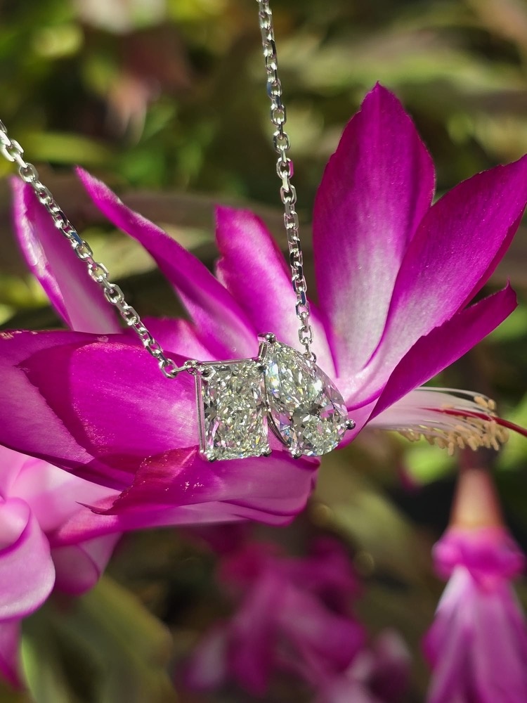 Both diamonds are IDI certified, ensuring exceptional quality and authenticity. Set in a sleek white gold frame, the pendant is suspended from a delicate white gold cable chain, adding a touch of refinement to its design.