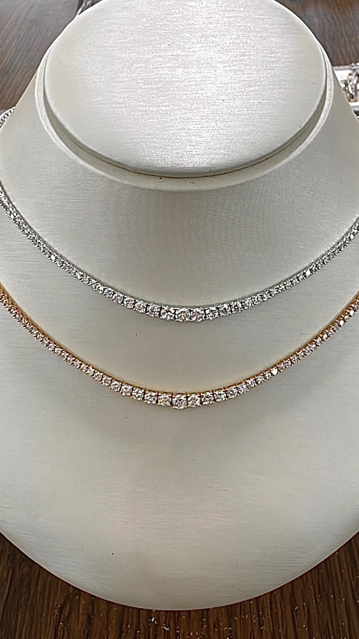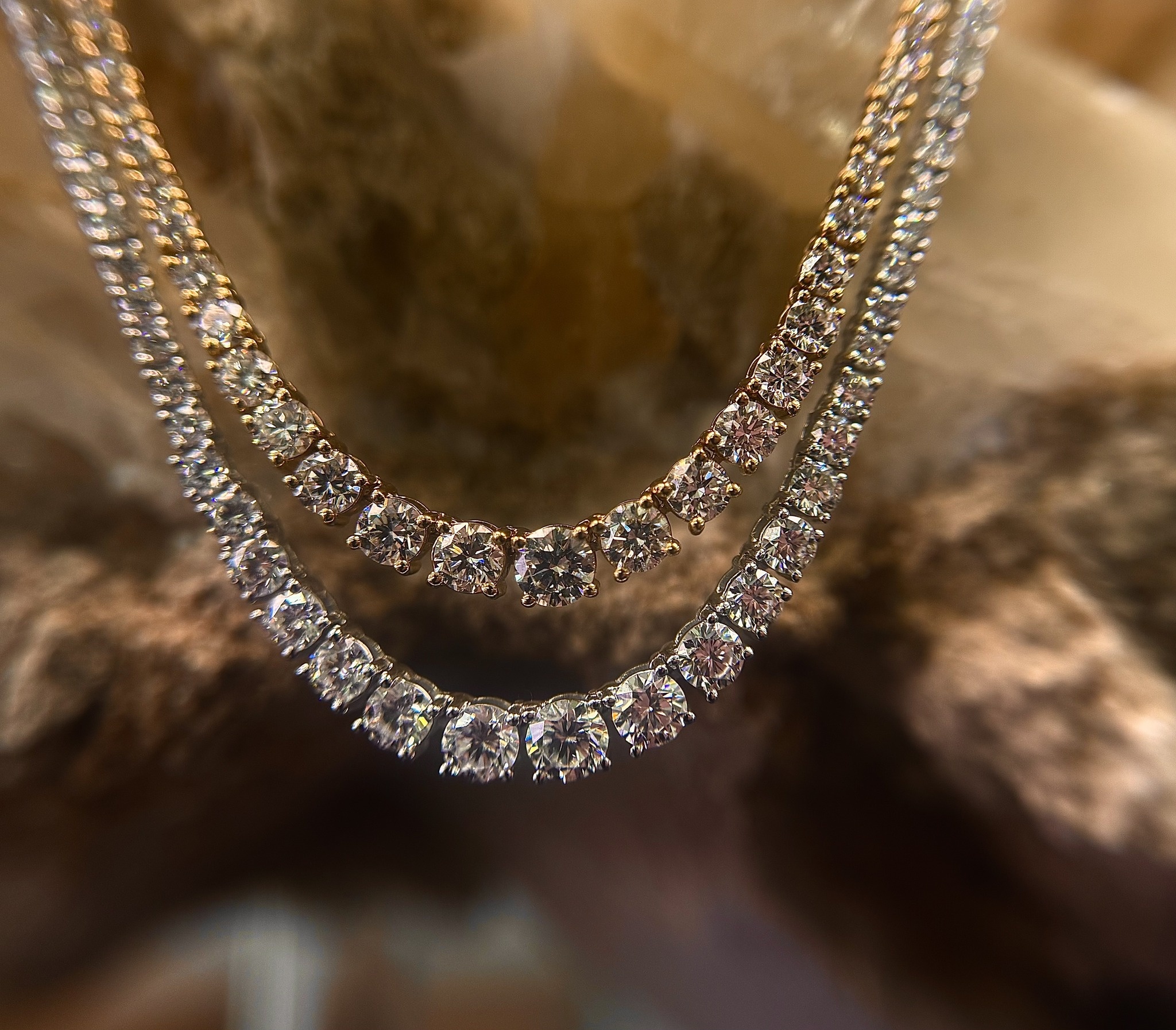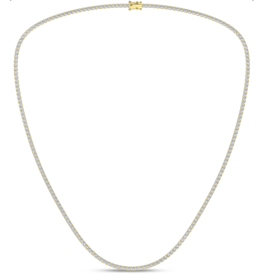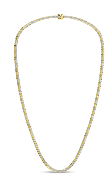 Classic lab-grown diamond graduation Riviera necklace, certified by IGI to ensure quality, set in 14K yellow gold, and studded with 7 ct. t.w. of diamonds in a timeless four-prong setting. The 17-inch necklace features diamonds boasting GH color and VS clarity, forming an exquisite piece that radiates elegance and captures the essence of sophistication.