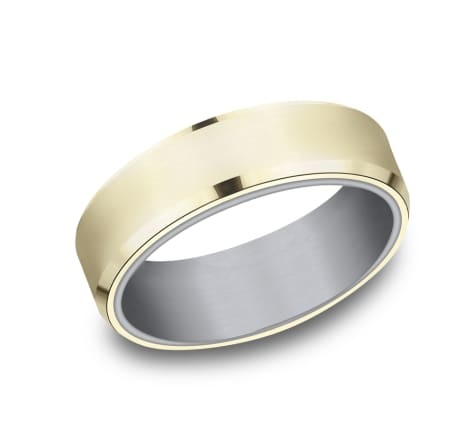 This 6.5mm comfort-fit band features a slightly beveled edge and a ring-in-ring design with both Yellow Gold and Grey Tantalum for a modern twist on a classic, two-toned look.