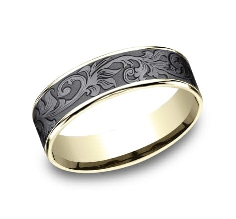 This vintage-inspired 6.5mm comfort-fit ring features a Tantalum floral script pattern with a thin, contrasting, Yellow Gold edges.