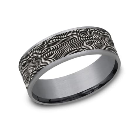 This incredible 7.5mm two-toned band with an intricate Gold Snakeskin center is framed beautifully by two thin Tantalum edges.