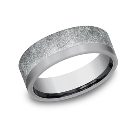 This stunning white Gold 7mm comfort-fit band has a beautiful swirl finish and an offset Tantalum accent for a modern two-tone effect.