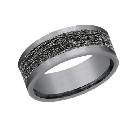 Channeling a love of nature, this 8mm comfort fit design ring features a unique White Gold wood motif beautifully contrasted with wear resistant black detailing and Tantalum edges.