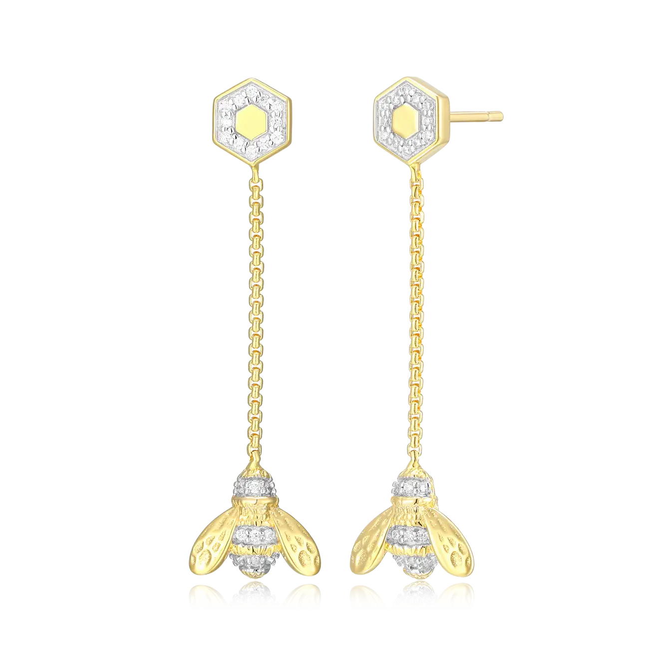 Honey Bee Dangle Stud Earrings in 14k Yellow Gold Plated Sterling Silver with Lab Diamonds